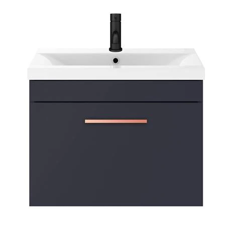 The contemporary matt blue Arezzo furniture range, with it’s clean lines this vanity unit is perfect for renewing the style in any bathroom. It’s stylish modern design hides all unsightly pipework creating a neat modern look. The units soft-closing drawer provides plenty of storage space for toiletries. Features an eye-catching and stylish matt blue finish with a on-trend minimalist rose gold square bar handle.