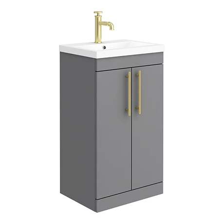 The contemporary matt grey Arezzo Industrial style furniture range. It’s simple design makes this 515mm wide cloakroom vanity unit a minimalist option well suited to smaller spaces, basin unit hides all unsightly pipework creating a neat modern look and provides plenty of storage space for toiletries. Features an eye-catching and stylish matt grey finish with on-trend round brushed brass knurled detail handles, great for creating an eye catching industrial look in your bathroom. Supplied with a quality 1 tap hole rectangular 40mm mid-edge ceramic sink.