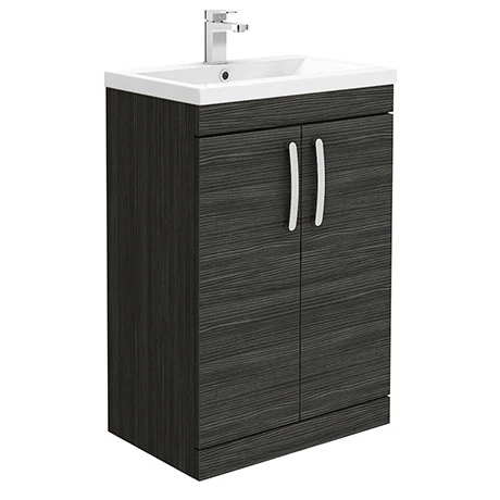 This Brooklyn Black Vanity Unit is a practical piece that’s also pleasing to the eye. Crafted from moisture resistant melamine faced chipboard in a woodgrain texture, it comes in Black for a statement look. At 610mm wide, this freestanding vanity unit offers plenty of room for storing bathroom essentials, keeping surfaces neat and tidy. The mid edged basin in white gloss ceramic makes a striking contrast with the black vanity unit. Matt chrome strap handles complete the modern design and the two soft closing doors prevent slamming. This unit even comes ready assembled for quick and easy installation.