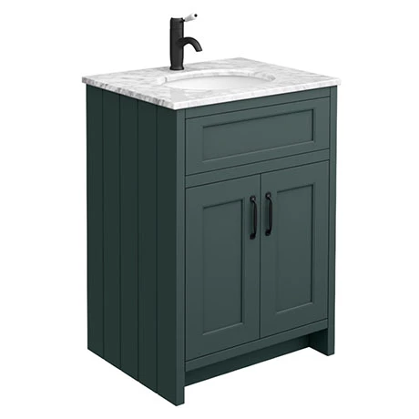 The Chatsworth traditional 610mm wide green vanity unit with marble basin top, Victorian inspired design with a modern twist. The Chatsworth range of charming bathroom furniture features classic styling with a satin green finish cabinet, tongue-and-groove side panelling and sturdy matt black handles.