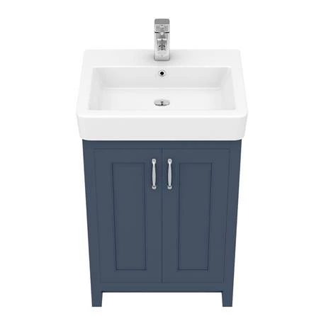 Add elegance to your bathroom with this Chatsworth Traditional Blue Vanity. Its tasteful panels in satin blue create the effect of natural wood. At 560mm wide, this freestanding vanity unit offers plenty of space inside for tucking away toiletries. Its two doors are soft closing to prevent unpleasant slamming noises and minimise unnecessary wear and tear. The blue vanity unit is topped with a durable sink with a white gloss finish that makes it quick and easy to wipe clean. Match this piece with the Chatsworth Traditional Blue Toilet Unit for a coordinated look.