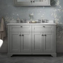 Old London 1200mm Cabinet & Double Bowl White Marble Top – Storm Grey