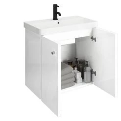 The London collection offers classic beauty with clean lines. This smooth white painted 60 Wall Hung Two Door Vanity Unit with Ceramic Basin features soft closing doors with an an internal adjustable wooden shelf. This unit also comprises of a single tap hole rectangular ceramic basin and a pair of stylish chrome handles. Fitted with mounting rails and brackets for adjustable and quick installation.
