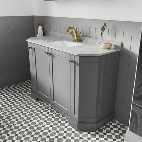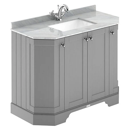 Old London furniture is the epitome of traditional design. This Art Deco styled Storm Grey 1000mm Angled Cabinet features soft close doors which limits the daily wear and tear and provides a quieter closing action. The luxury Grey polished marble top achieves a timeless, classic look. This art deco vanity unit is ideal for creating a period look in your bathroom, with it’s clean classical design blending beautifully with Old London’s range of traditional bathroom furniture.