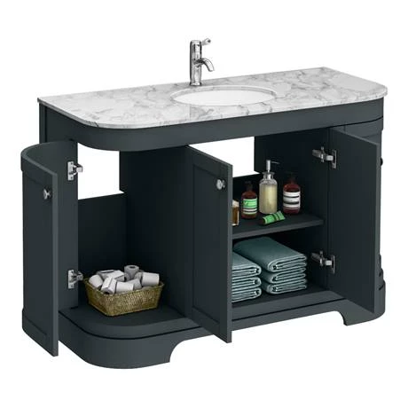 The Period Bathroom Company traditional 1220mm wide dark grey coloured curved vanity unit with white marble basin top; Victorian inspired design with a modern twist. The Period Bathroom Company range of charming bathroom furniture features a satin finish with clean lines and a recessed center panels for a classic look.