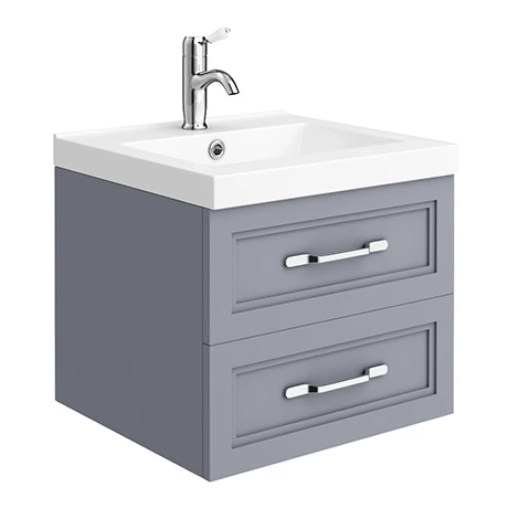 Provide a beautiful finishing touch in your bathroom with the Period Bathroom Company traditional 500mm compact 2 drawer wall hung satin grey vanity unit with gloss white basin top. Victorian inspired design with a modern twist, a great alternative to the basin and pedestal, The Period Bathroom Company’s range of charming wall hung bathroom furniture features classic styling with a satin finish cabinet and a traditional polished chrome strap design handle. The 2 soft-close drawers eliminates slams and provides generous storage space for your toiletries, helping to keep your bathroom clutter free.