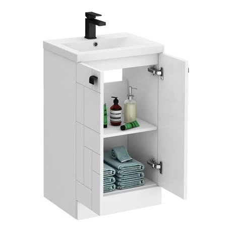The Venice Abstract 500mm White 2-Door Floor Standing Vanity Unit with Matt Black Drop Handles features an eye-catching geometric design that will create a style statement in your bathroom. It has ample storage with soft-closing cupboard doors and an internal shelf to keep your toiletries organised. A ceramic basin slots perfectly on top and all pipework is neatly concealed within the unit. Manufactured from quality materials, this vanity unit comes fully assembled and is finished in white satin.